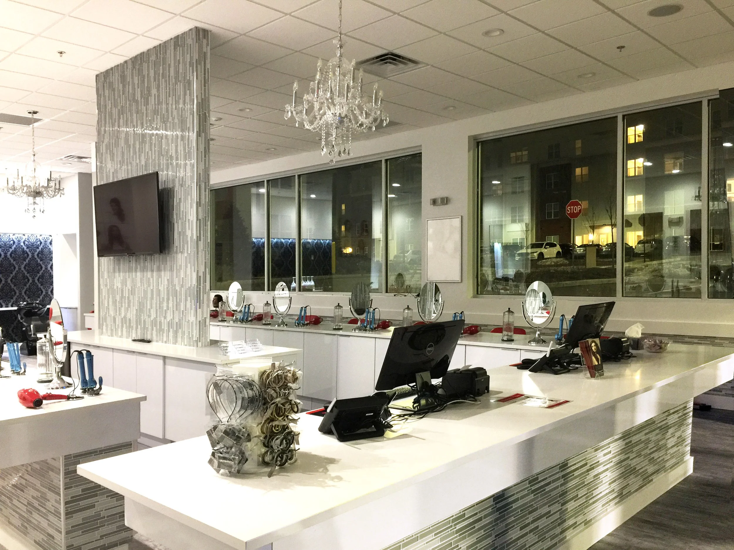 MODERN SALON FACILITY DESIGNED TO REFLECT A CLEAN AND POLISHED ENVIRONMENT. THE SPACE IS ORGANIZED WITH SLEEK WHITE SERVICE STATIONS, GLOSSY FINISHES, AND BACKLIT MIRRORS, CREATING A BRIGHT AND PROFESSIONAL ATMOSPHERE SUITED FOR HIGH-VOLUME HAIR STYLING AND BEAUTY SERVICES.